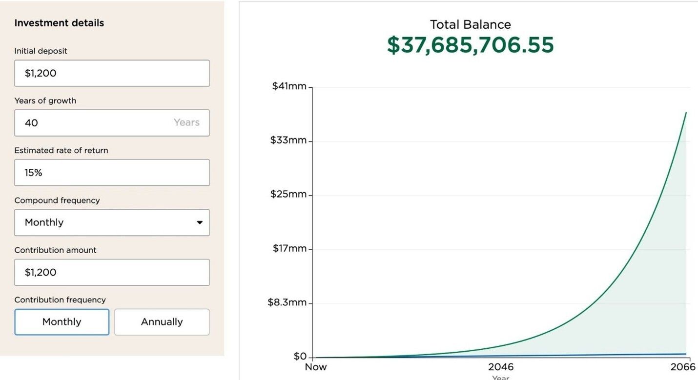 It illustrates what can happen if someone invests just $1,200/Mo (that’s just $300/week), with an average annual return of 15%, over a 40 year time period.